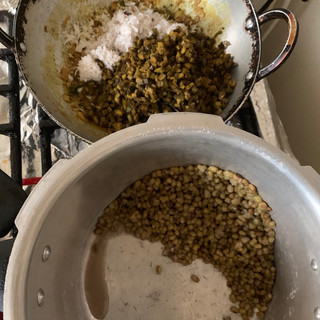 Soak this overnight or for 4 hours in enough water.Drain and pressure cook the soaked Cherupayar by adding 1/4 cup water (without adding salt)for a whistle.